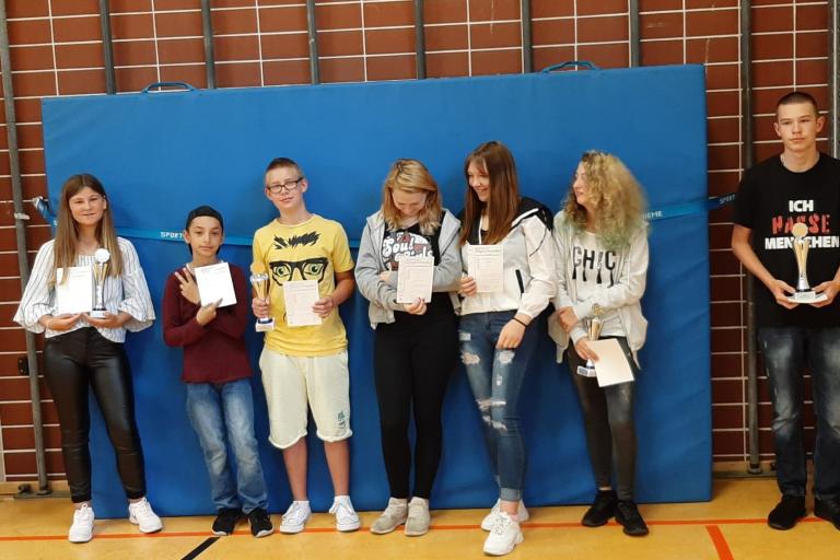 Diese sechs Leichtathleten nahmen im Rahmen der Entlassfeier der Schulabgänger (Cecilia und Marvin) und am letzten Schultag in unserer Sporthalle (Angelina, Vanessa, Liam und Adrian) die Siegerpokale in Empfang. So macht Sport Spaß!