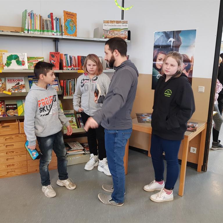 Dilara und Jason haben die Karteikarten für die Ausleihe beschriftet und die Büchereiordnung ausgegeben. Mit einem Quiz hat Leon die Mitschüler zum Rätseln gebracht, sie mussten z.B. herausfinden, welches Buch die meisten Seiten hat oder welches Buch so schwer wie ein Schokoladen-Weihnachtsmann ist. Der Sieger erhält einen Büchergutschein. Ein Bücherflohmarkt stand bereit. Zum Abschluss gab es für alle Schüler Muffins, die im Hauswirtschaftsunterricht am Vortag selbst gebacken wurden.