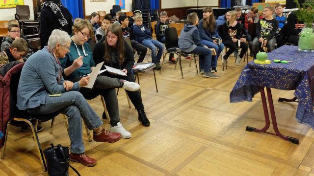 Mit Hilfe der Jury (Christiane Gernert als Elternvertreterin, den Siebtklässlern Caroline Baum und Elia und Sabine Ahrens als Lehrkraft und Verantwortliche für die Schülerbücherei) wurde die Aula vorbereitet und die Schülerinnen und Schüler der Klassen 5 und 6 als Zuhörer eingeladen.