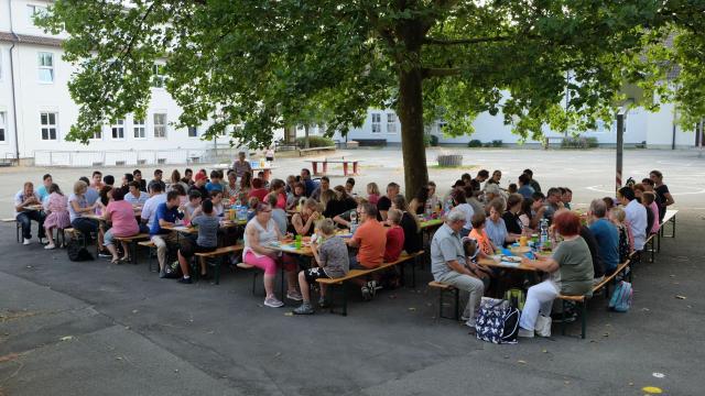 Das Wetter hat es gut gemeint mit der Pestalozzischule. Ein gemeinsames Schulfrühstück unter freiem Himmel mit Eltern, Großeltern und natürlich unseren Schülerinnen und Schülern eröffnete das Schuljahr 2018/19. Unsere kommissarische Schulleiterin Frau Schimmelmann gab mit ihrer kurzen emotionalen Ansprache, in der sie sich insbesondere für den Einsatz der Schülerschaft und der Elternvertreter für den Erhalt der Pestalozzischule im letzten Schuljahr bedankte, den Startschuss zum Frühstücksschmaus. So hatten auch die neuen Schüler und ihre Eltern die Gelegenheit, ihre Klassenkameraden und Klassenlehrerinnen in ungezwungener Atmosphäre kennenzulernen. Eine gelungene Veranstaltung, die den guten Zusammenhalt der Schule nachdrücklich veranschaulicht hat.