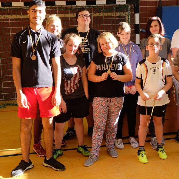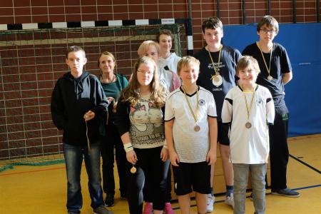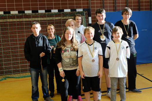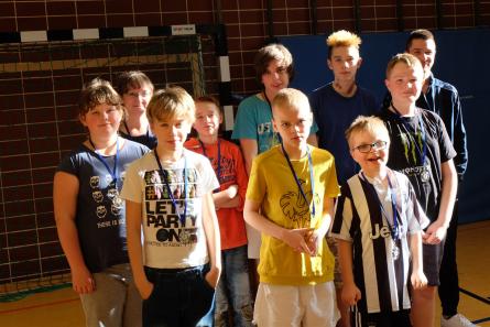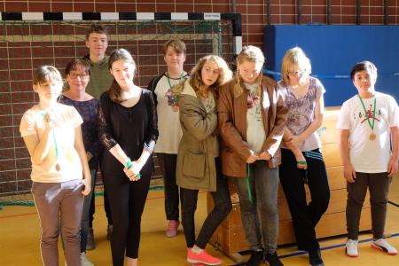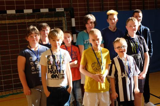 Unsere angetretenen Mädchen und Jungen der Klassen 5 bis 10 spielten mit großem Einsatz die Siegermedaillen aus. Die fünf aus allen Klassen gelosten Teams spielten im Modus „Jeder gegen Jeden“. Wer gewinnt die meisten Spiele? Es gab viele begeisternde Matches mit knappen Ergebnissen. Auf den Fotos könnt ihr sehen, wer die Gold-, Silber-, Bronze- und Teilnahmemedaillen gewonnen hat. Am Ende waren wir alle Gewinner!