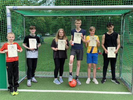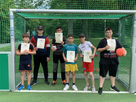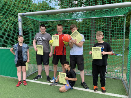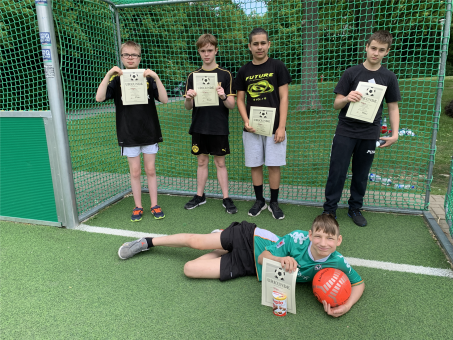 Acht Mannschaften spielten das Turnier im Vor- und Finalrundenmodus. Nach spannenden Spielen - eine Partie in der Finalrunde wurde erst im 11m-Schießen entschieden - siegte im Endspiel das Team „Blutrot“ gegen das Team „Grasgrün“ mit 5:3. Schaut euch die acht Mannschaften auf den Fotos an.