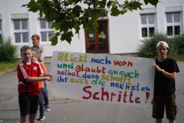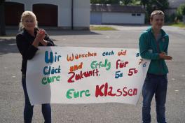 Auf dem Schulhof gab es dann eine kulinarische Stärkung von Frau Schindler und ihrem Team und aufmunternde Plakatwünsche für die Zukunft von den anderen Klassen der Pestalozzischule.