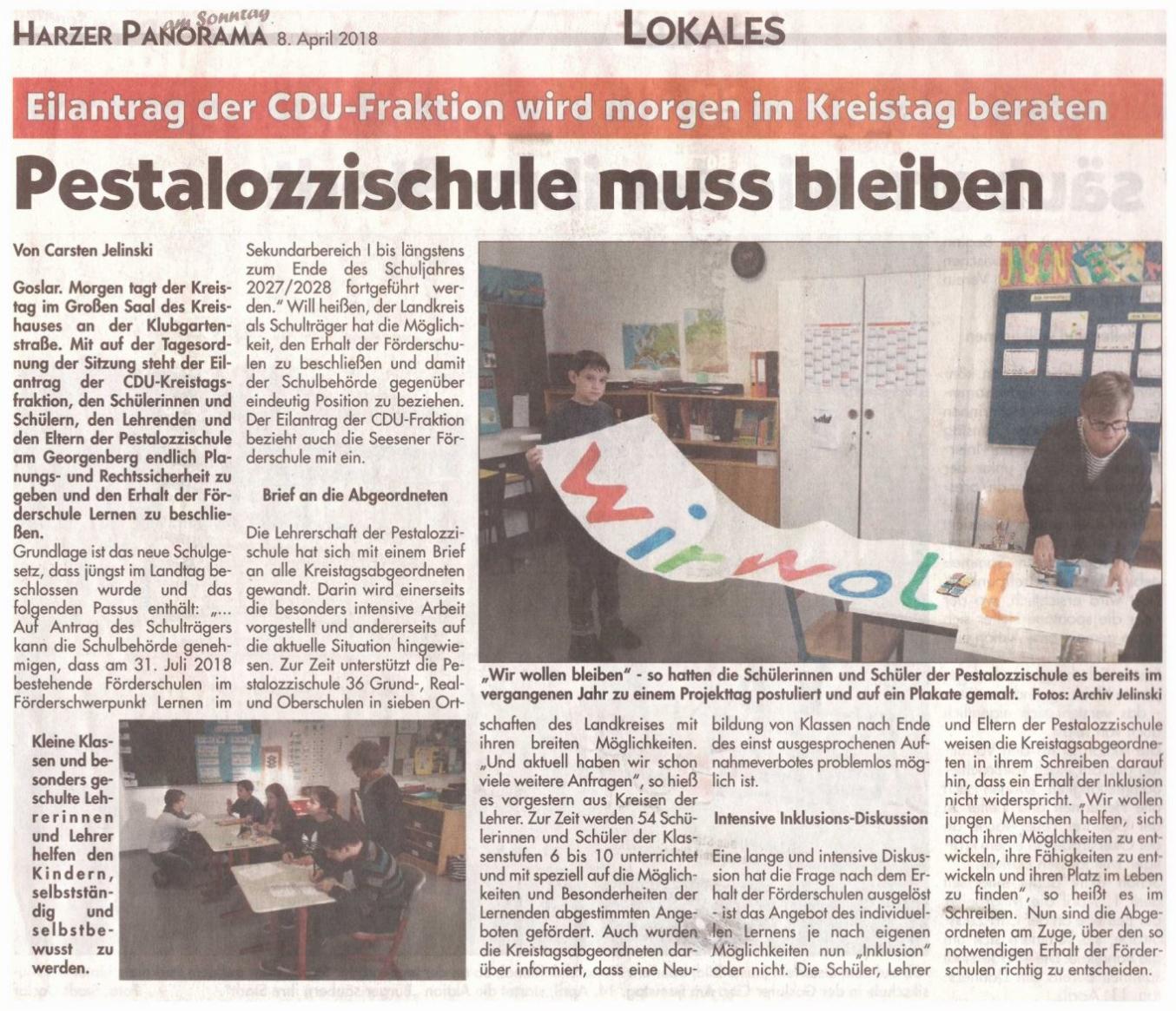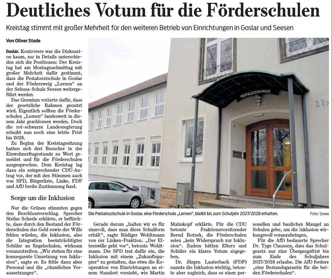 Goslar. Morgen tagt der Kreistag im Großen Saal des Kreishauses an der Klubgartenstraße. Mit auf der Tagesordnung der Sitzung steht der Eilantrag der CDU-Kreistagsfraktion, den Schülerinnen und Schülern, den Lehrenden und den Eltern der Pestalozzischule Georgenberg endlich Planung- und Rechtssicherheit zugeben und den Erhalt der Förderschule Lernen zu beschließen.