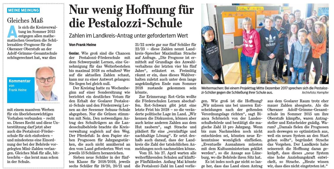 Der Kreistag hatte zu Wochenbeginn auf einer Sondersitzung wie berichtet ein deutliches Votum für den Erhalt der Goslarer Pestalozzi-Schule und den Förderzweig Lernen an der Seesener Sehusa-Schule abgegeben. Nur die Grünen stimmten mit Nein. Den notwendigen Antrag des Schulträgers an die Landesschulbehörde brachte die Kreisverwaltung sogleich auf den Weg. Der Pferdefuß: In dem Papier stehen Prognosen für Jahrgangsstärken, die auch nicht annähernd an den vom Land geforderten Wert von jeweils 13Schülern heranreichen.