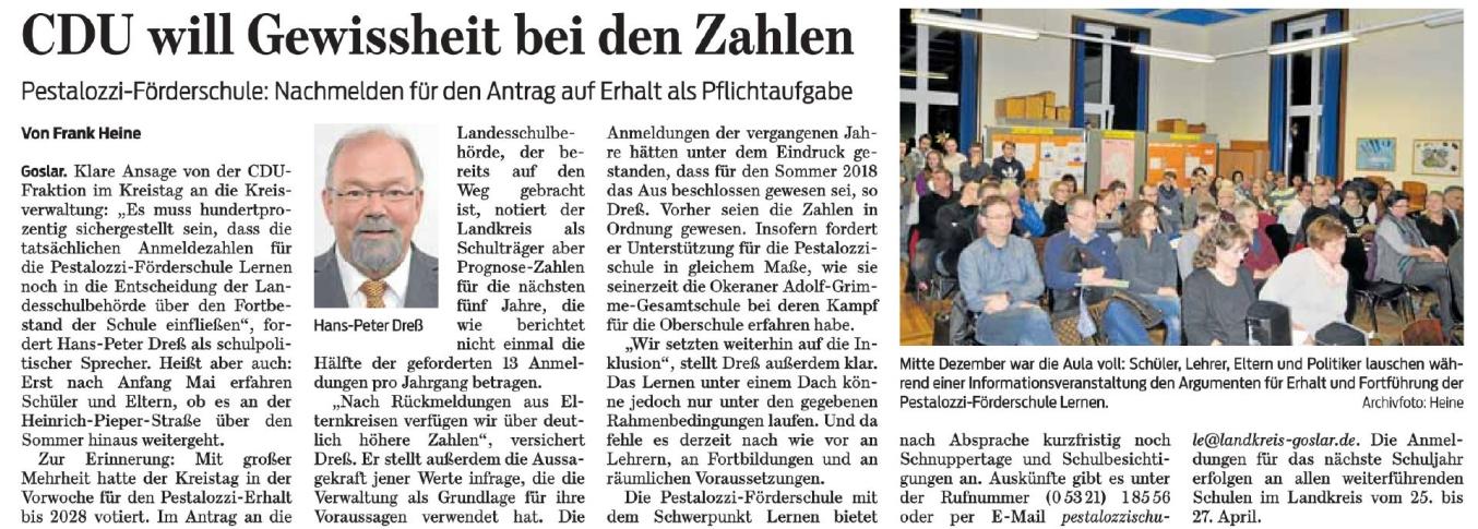 CDU will Gewissheit bei den ZahlenGoslar. Klare Ansage von der CDUFraktion im Kreistag an die Kreisverwaltung: "Es muss hundertprozentig sichergestellt sein, dass die tatsächlichen Anmeldezahlen für die Pestalozzi-Förderschule Lernen noch in die Entscheidung der Landesschulbehörde über den Fortbestand der Schule einfließen", fordert Hans-Peter Dreß als schulpolitischer Sprecher. Heißt aber auch: Erst nach Anfang Mai erfahren Schüler und Eltern, ob es an der Heinrich-Pieper-Straße über den Sommer hinaus weitergeht. Zur Erinnerung: Mit großer Mehrheit hatte der Kreistag in der Vorwoche für den Pestalozzi-Erhalt bis 2028 votiert. Im Antrag an die Landesschulbehörde, der bereits auf den Weg gebracht ist, notiert der Landkreis als Schulträger aber Prognose-Zahlen für die nächsten fünf Jahre, die wie berichtet nicht einmal die Hälfte der geforderten 13 Anmeldungen pro Jahrgang betragen. "Nach Rückmeldungen aus Elternkreisen verfügen wir über deutlich höhere Zahlen", versichert Dreß. Er stellt außerdem die Aussagekraft jener Werte infrage, die die Verwaltung als Grundlage für ihre Voraussagen verwendet hat. Die Anmeldungen der vergangenen Jahre hätten unter dem Eindruck gestanden, dass für den Sommer 2018 das Aus beschlossen gewesen sei, so Dreß. Vorher seien die Zahlen in Ordnung gewesen. Insofern fordert er Unterstützung für die Pestalozzischule in gleichem Maße, wie sie seinerzeit die Okeraner Adolf-Grimme-Gesamtschule bei deren Kampf für die Oberschule erfahren habe. "Wir setzten weiterhin auf die Inklusion", stellt Dreß außerdem klar. Das Lernen unter einem Dach könne jedoch nur unter den gegebenen Rahmenbedingungen laufen. Und da fehle es derzeit nach wie vor an Lehrern, an Fortbildungen und an räumlichen Voraussetzungen. Die Pestalozzi-Förderschule mit dem Schwerpunkt Lernen bietet nach Absprache kurzfristig noch Schnuppertage und Schulbesichtigungen an. Auskünfte gibt es unter der Rufnummer (0 53 21) 1 85 56 oder per E-Mail pestalozzischule@landkreis-goslar.de. Die Anmeldungen für das nächste Schuljahr erfolgen an allen weiterführenden Schulen im Landkreis vom 25. bis 27. April.