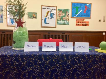 Mit Hilfe der Jury (Christiane Gernert als Elternvertreterin, den Siebtklässlern Caroline Baum und Elia und Sabine Ahrens als Lehrkraft und Verantwortliche für die Schülerbücherei) wurde die Aula vorbereitet und die Schülerinnen und Schüler der Klassen 5 und 6 als Zuhörer eingeladen.