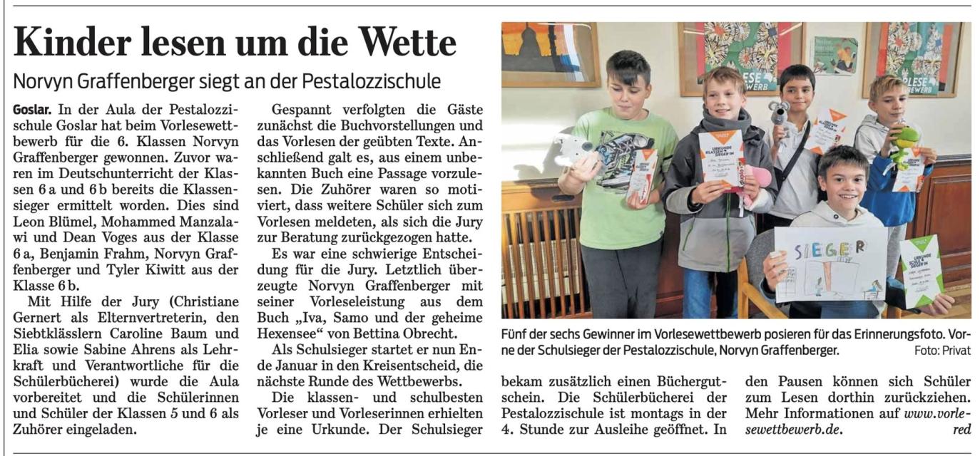 Am 24.November fand in der Aula der Pestalozzischule Goslar der diesjährige Vorlesewettbewerb für die 6. Klassen statt. Zuvor wurden im Rahmen des Deutschunterrichts der Klassen 6a und 6b bereits die Klassensieger ermittelt: