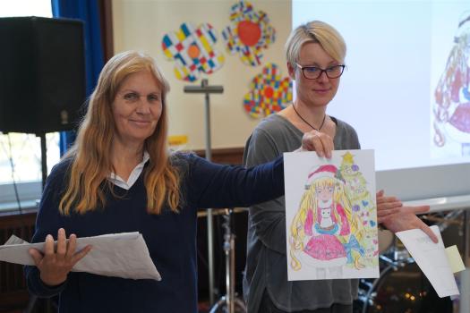 Bereits zum elften Mal fand in der Pestalozzischule ein Weihnachtsmalwettbewerb statt, an der sich alle Klassen beteiligten. Nach der Pensionierung von Jutta Kynast hat Vanessa Lumack den Staffelstab aufgenommen, wobei sie immer noch tatkräftig - so auch bei der Siegerehrung - von Jutta Kynast unterstützt wurde.
