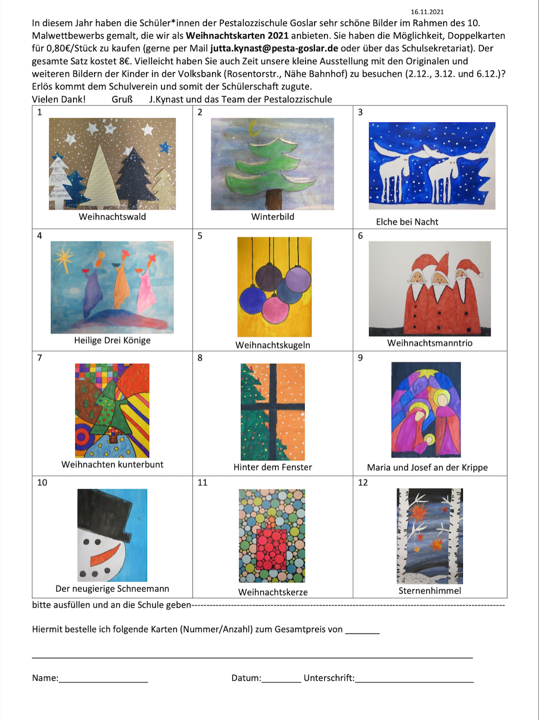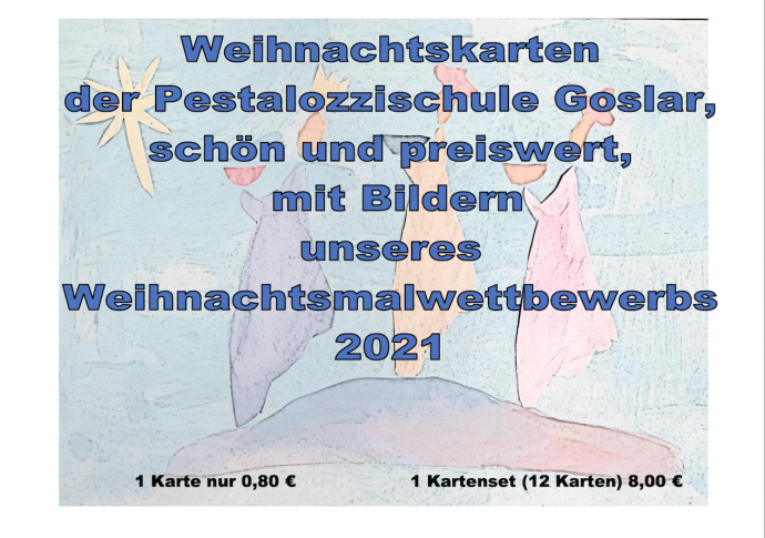 Käuflich zu erwerben sind sie zu einem Einzelpreis von 0,80 € pro Doppelkarte mit Kuvert oder aber als Satz (alle 12 Karten) für 8,00 €. Dies ist möglich in der Pestalozzischule über das Sekretariat oder per Mailkontakt an (anV0dGEua3luYXN0QHBlc3RhLWdvc2xhci5kZQ==@invalid).