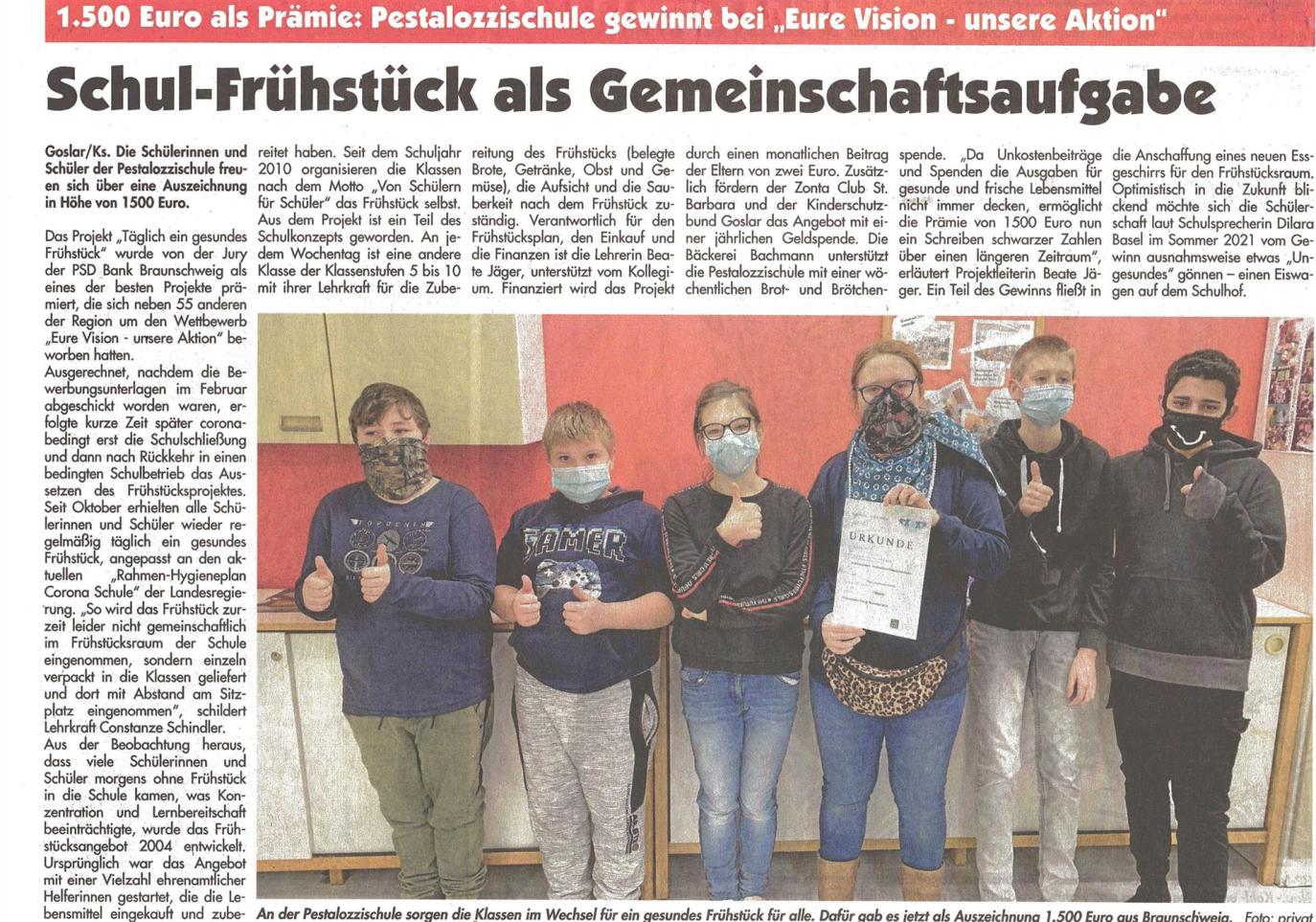 Die Schülerinnen und Schüler der Pestalozzischule freuen sich über eine Auszeichnung in Höhe von 1500 Euro. Das Projekt „Täglich ein gesundes Frühstück“ wurde von der Jury der PSD Bank Braunschweig als eines der besten Projekte, die sich neben 56 anderen der Region um den Wettbewerb „Eure Vision - unsere Aktion“ beworben hatten, prämiert.