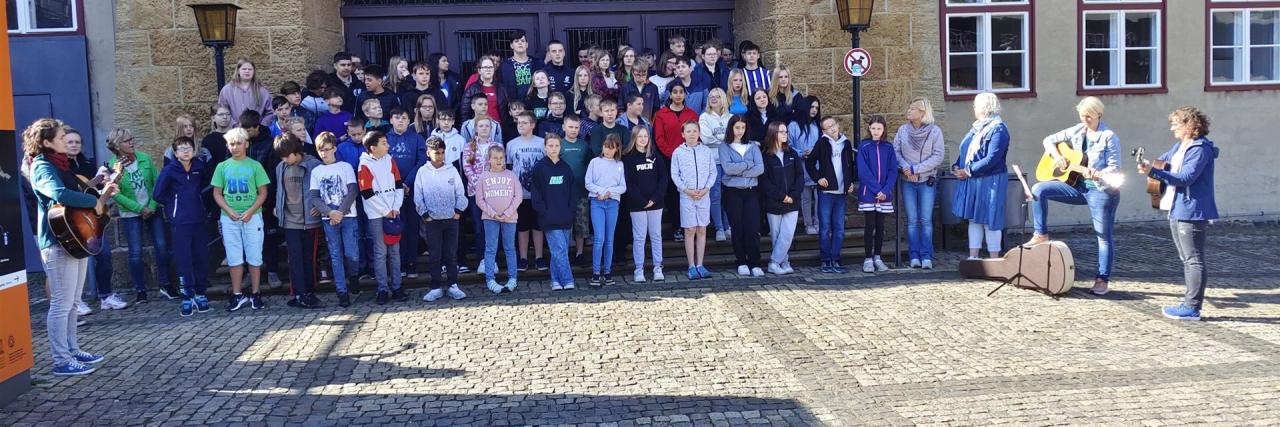Auftritt der Schule mit dem Steigerlied am Rammelsberg. - Videos